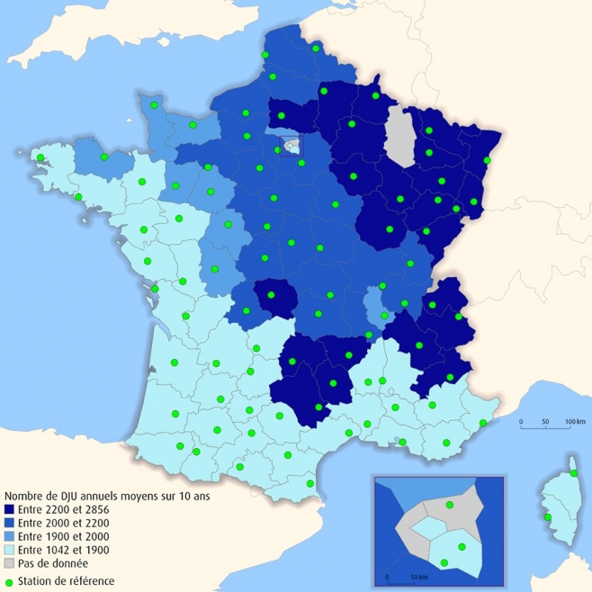 • En Ile de France, 3 stations météorologiques fournissent quotidiennement les valeurs de DJU : Paris Montsouris, Paris Orly et Paris le Bourget