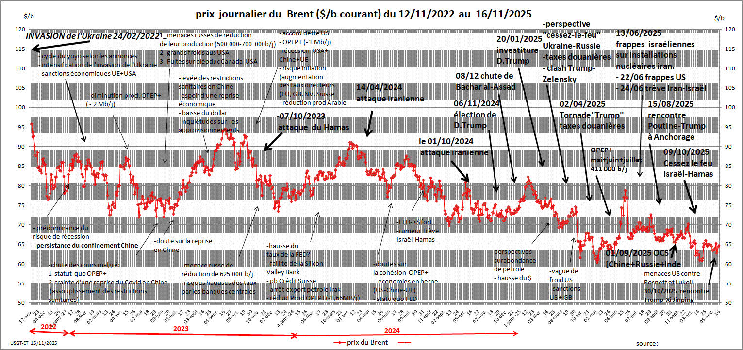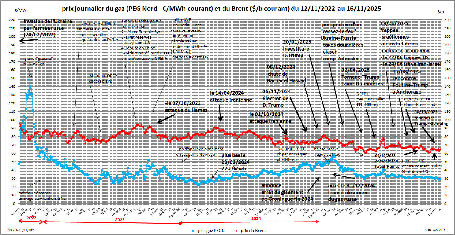 - €/MWh) + du Brent en ($/B) _ maj: 15/11/2025____- pour