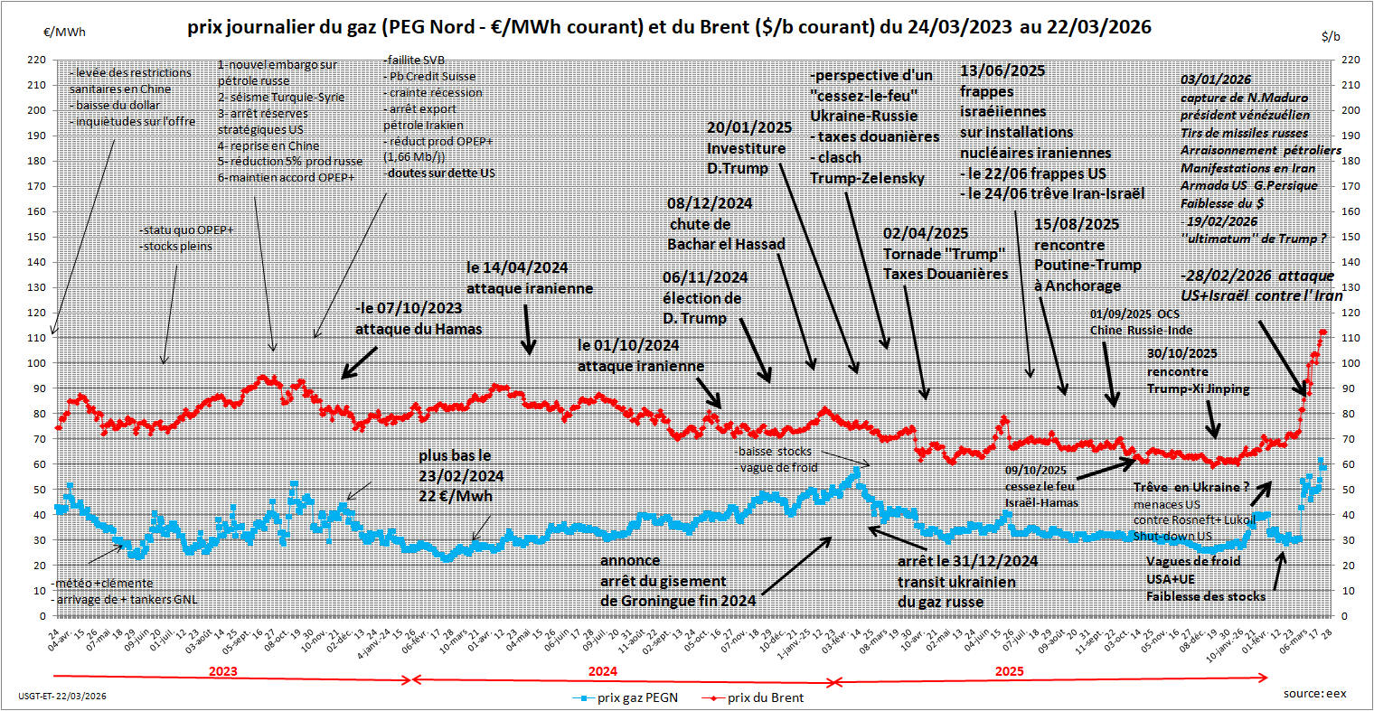 - €/MWh) + du Brent en ($/B) _ maj: 22/03/2026____- pour